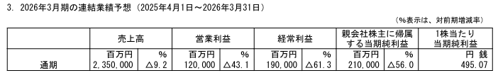 連結売上高は10.2%減で、経常利益は56.1%減の1,268億3,300万円となっています。